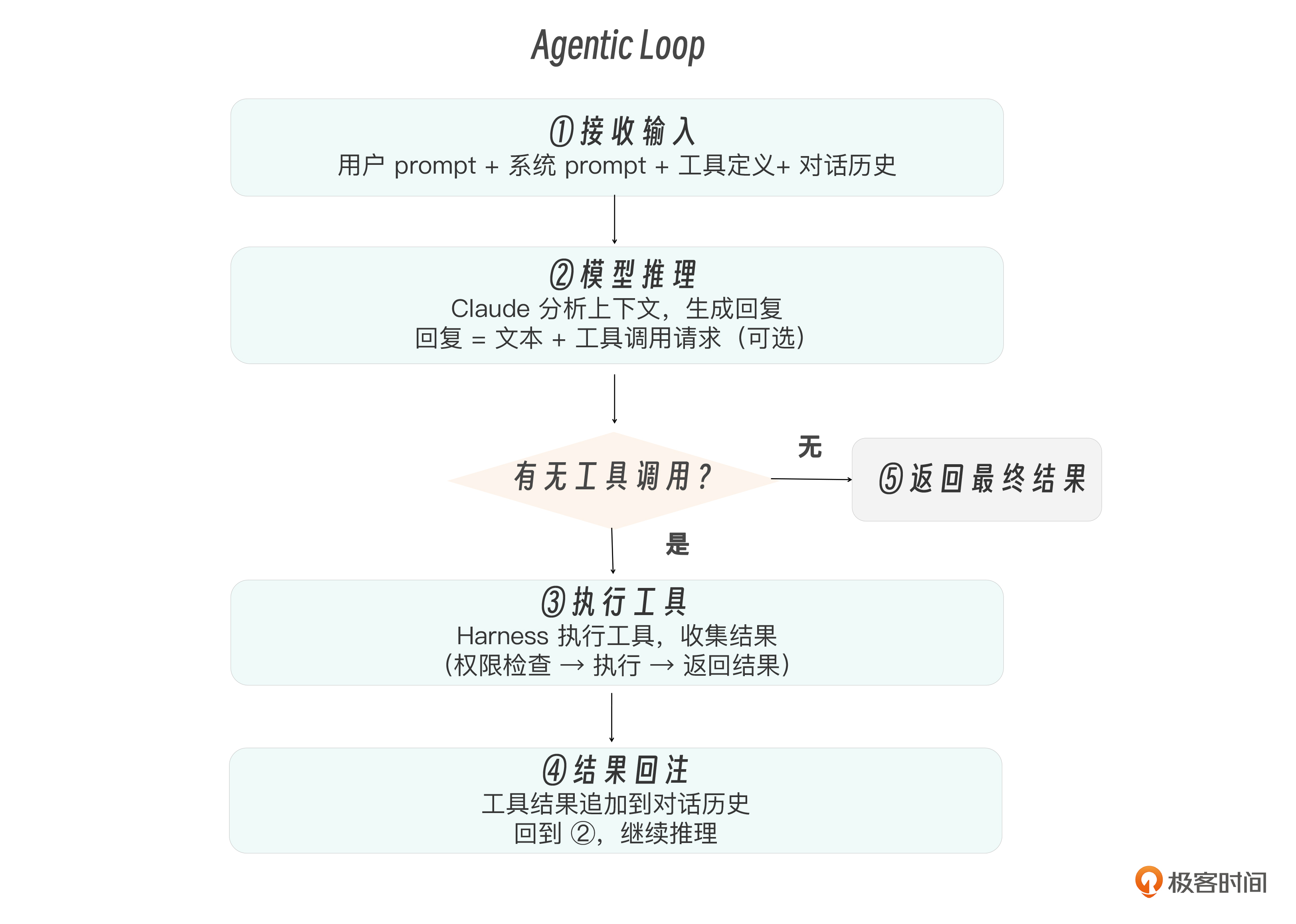 如果 Harness 是一台机器,Agentic Loop 就是它的发动机。整个 Claude Code 的运转,归根到底就是一个循环: