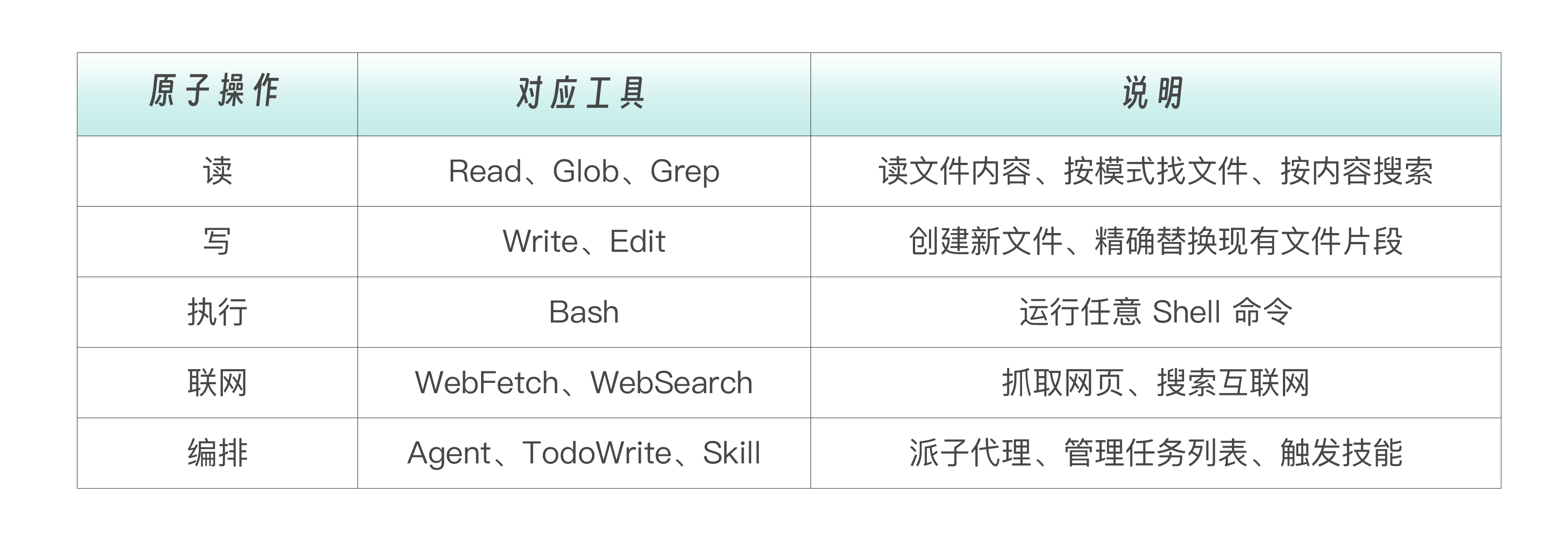 Agentic Loop 是引擎,工具是车轮。Claude Code 内置了 20+ 个左右的工具,覆盖了软件工程的五个原子操作。