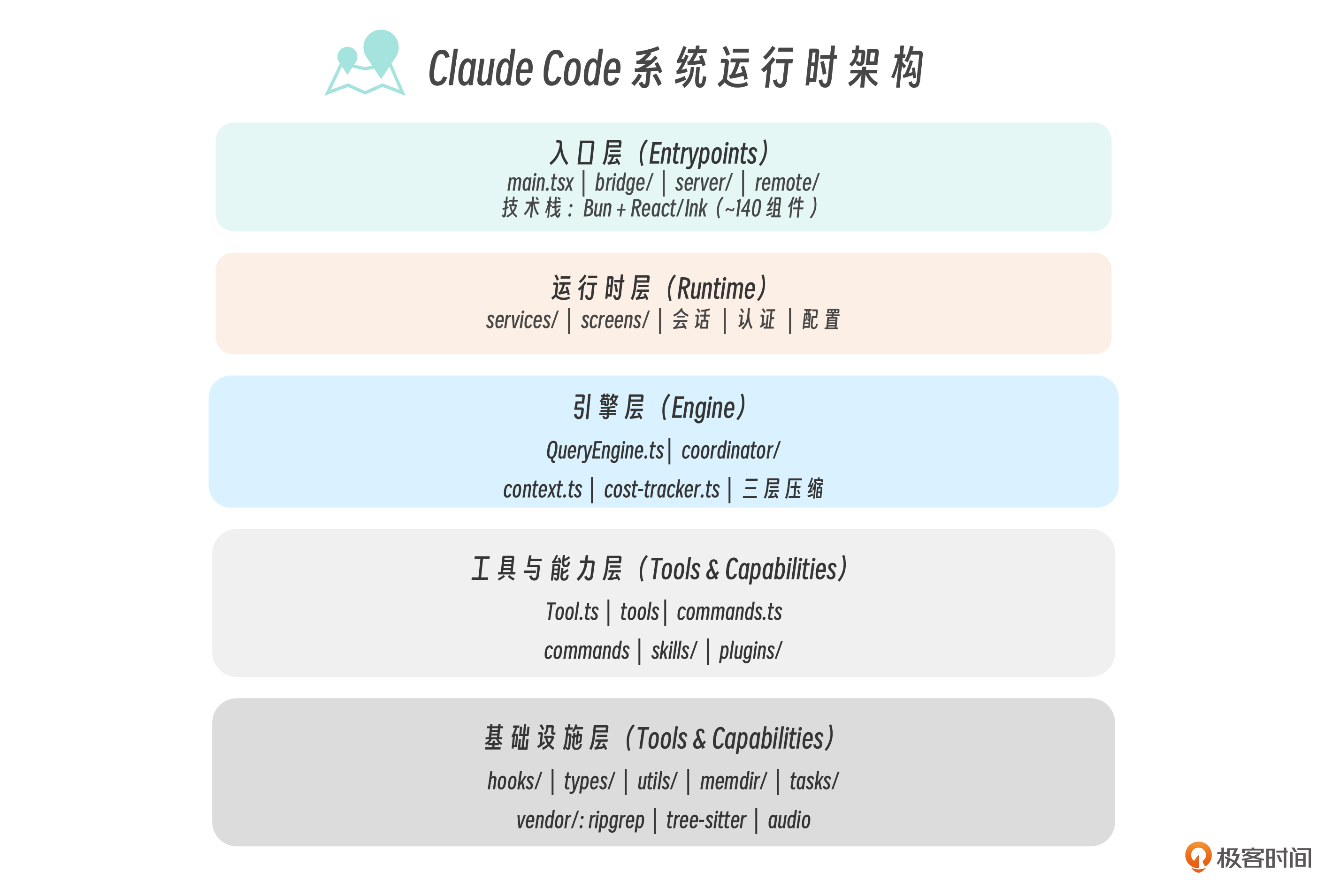 下面是从代码中分析出来的Claude Code的真实系统架构,和我们之前的拆解的确有很多不谋而合之处。—— 当然,我们之前是从使用者的角度拆解,这个则是实打实的系统运行时架构。