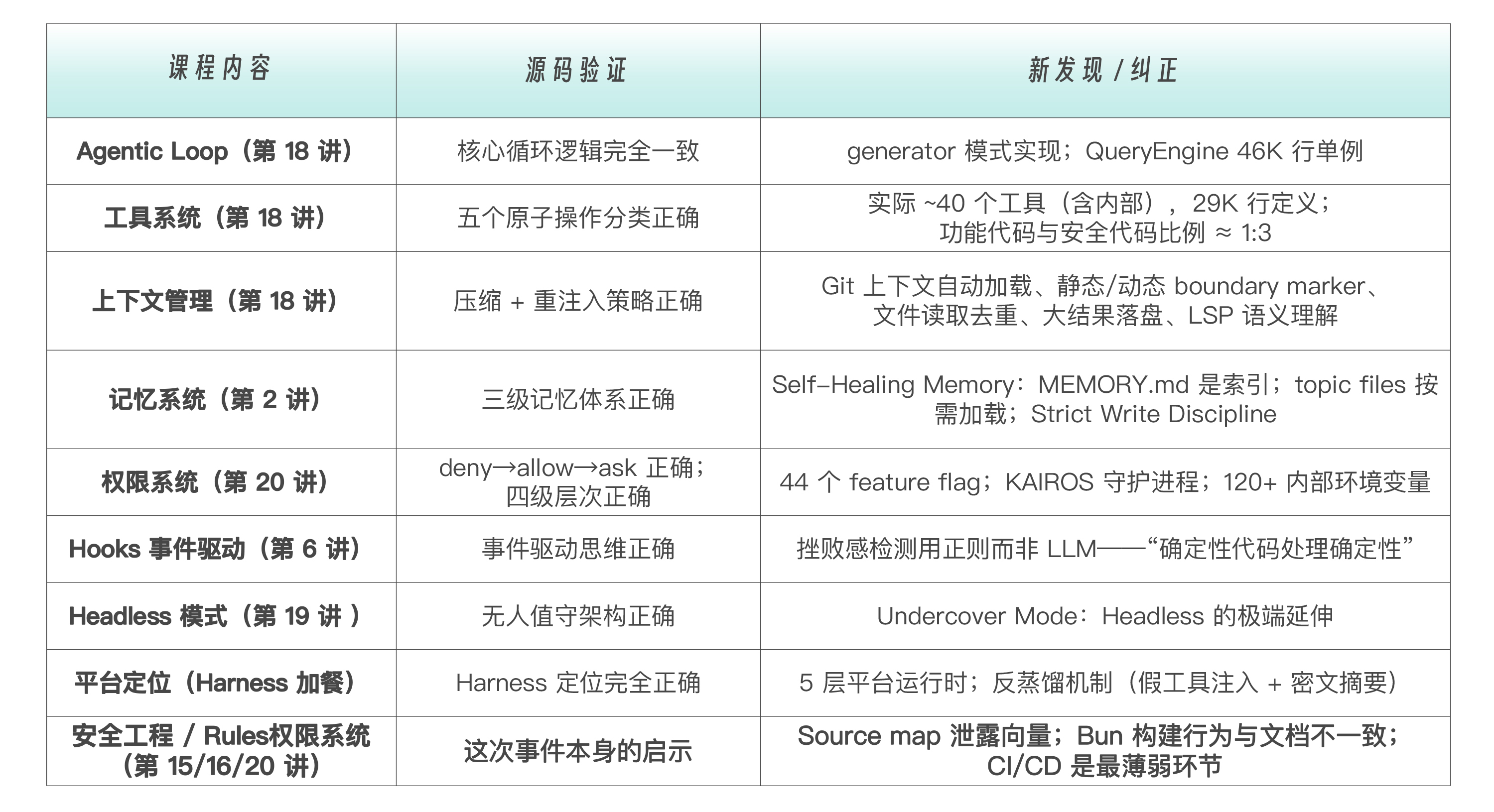 十个模块,十次验证。 从课程角度,最重要的结论是, 我们对 Harness 架构的理解是正确的。 Agentic Loop、工具权限门控、上下文工程、记忆持久化——这些概念不是臆想,是 Claude Code 内部实际使用的设计模式。