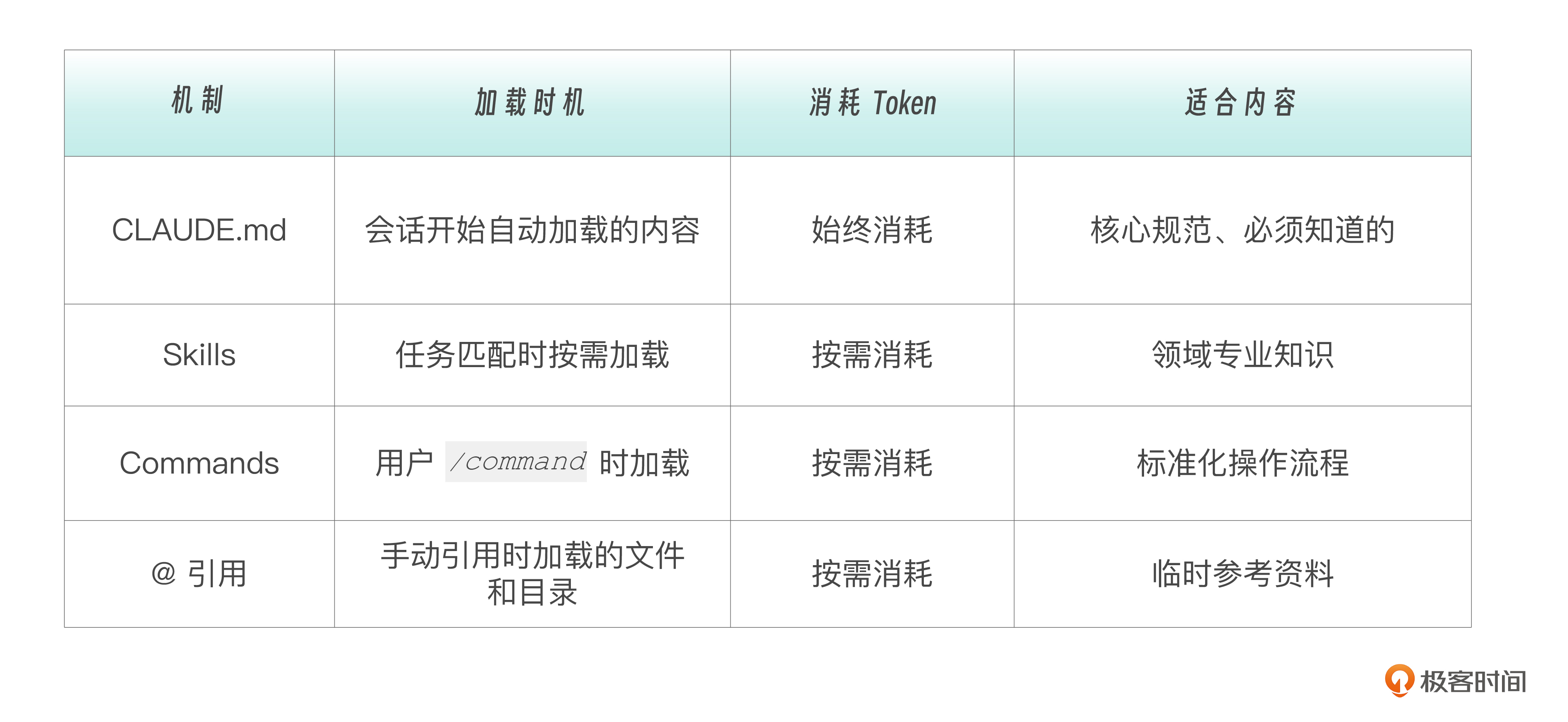 Claude Code 有多种方式获取项目相关知识,它们的区别如下表所示:
