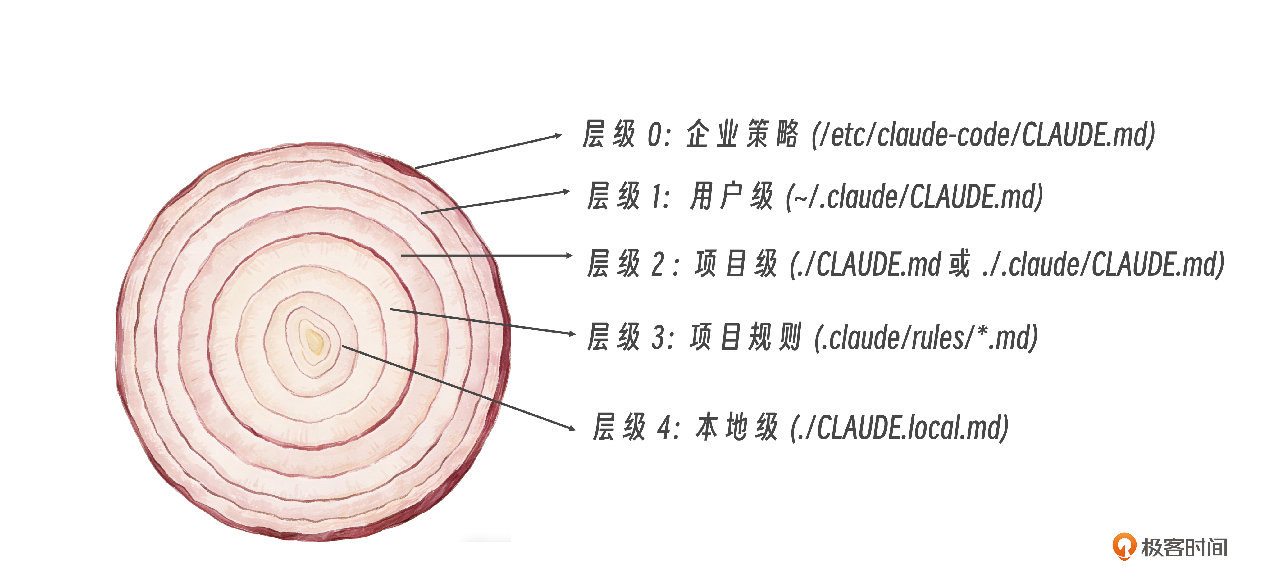 Claude Code 支持五个层级的记忆,就像洋葱一样,从外到内,按 层级结构 组织——高层级的文件优先加载,为底层文件提供基础:
