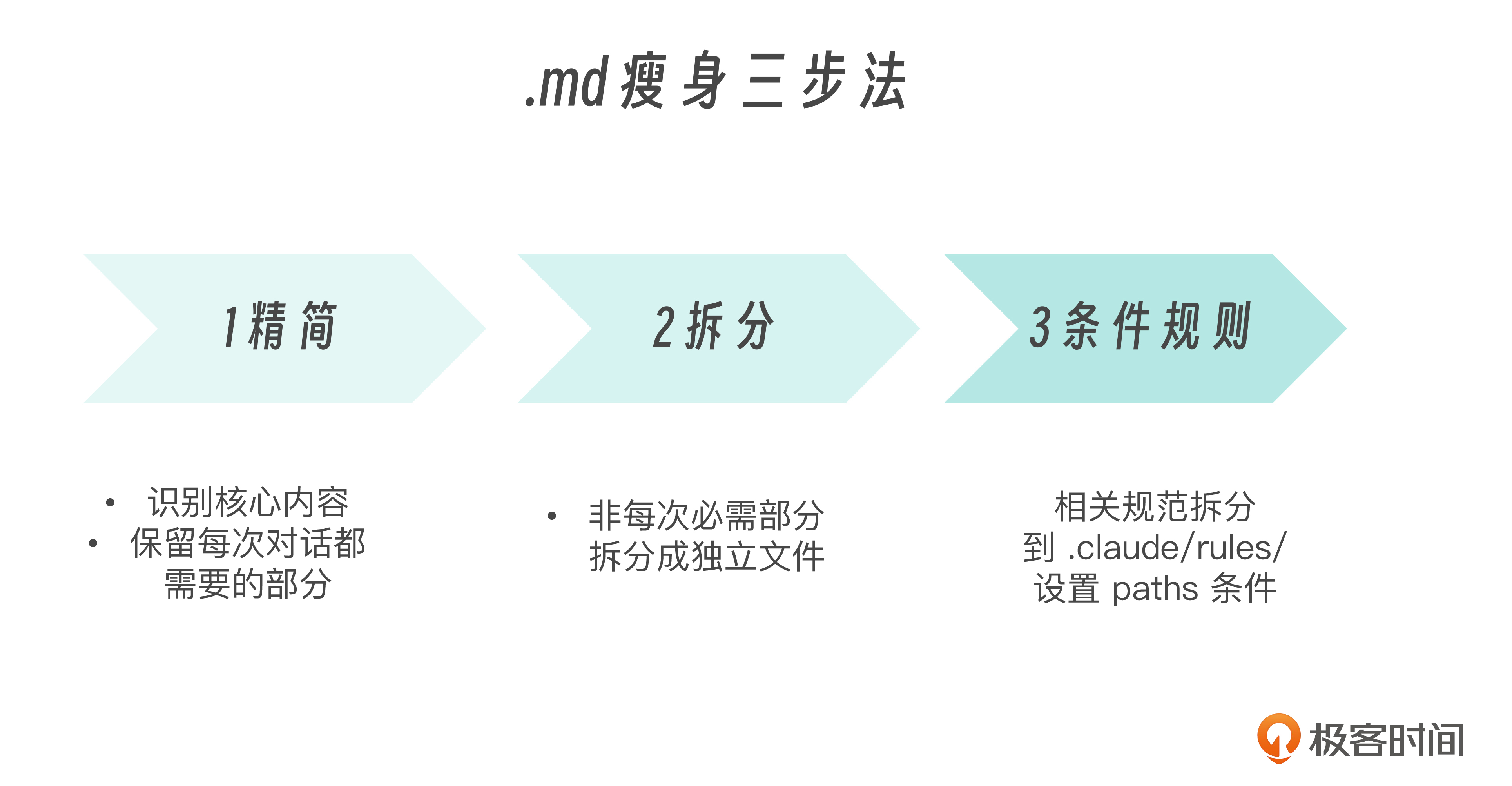当Claude 响应明显变慢,经常出现上下文长度警告,而且Claude“忘记”对话早期的内容时,可以采用 “.md瘦身三步法”:精简 → 拆分 → 条件规则。