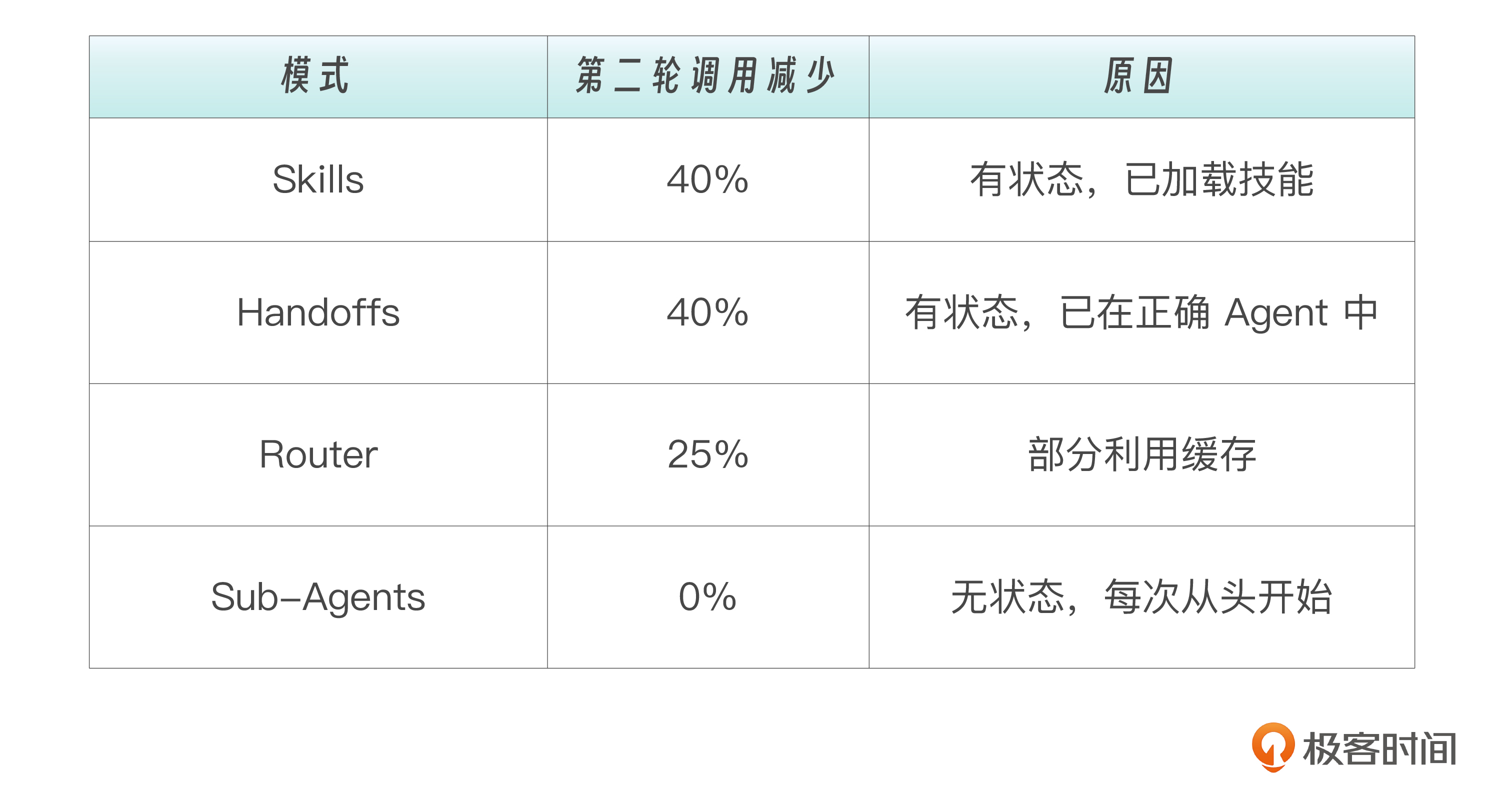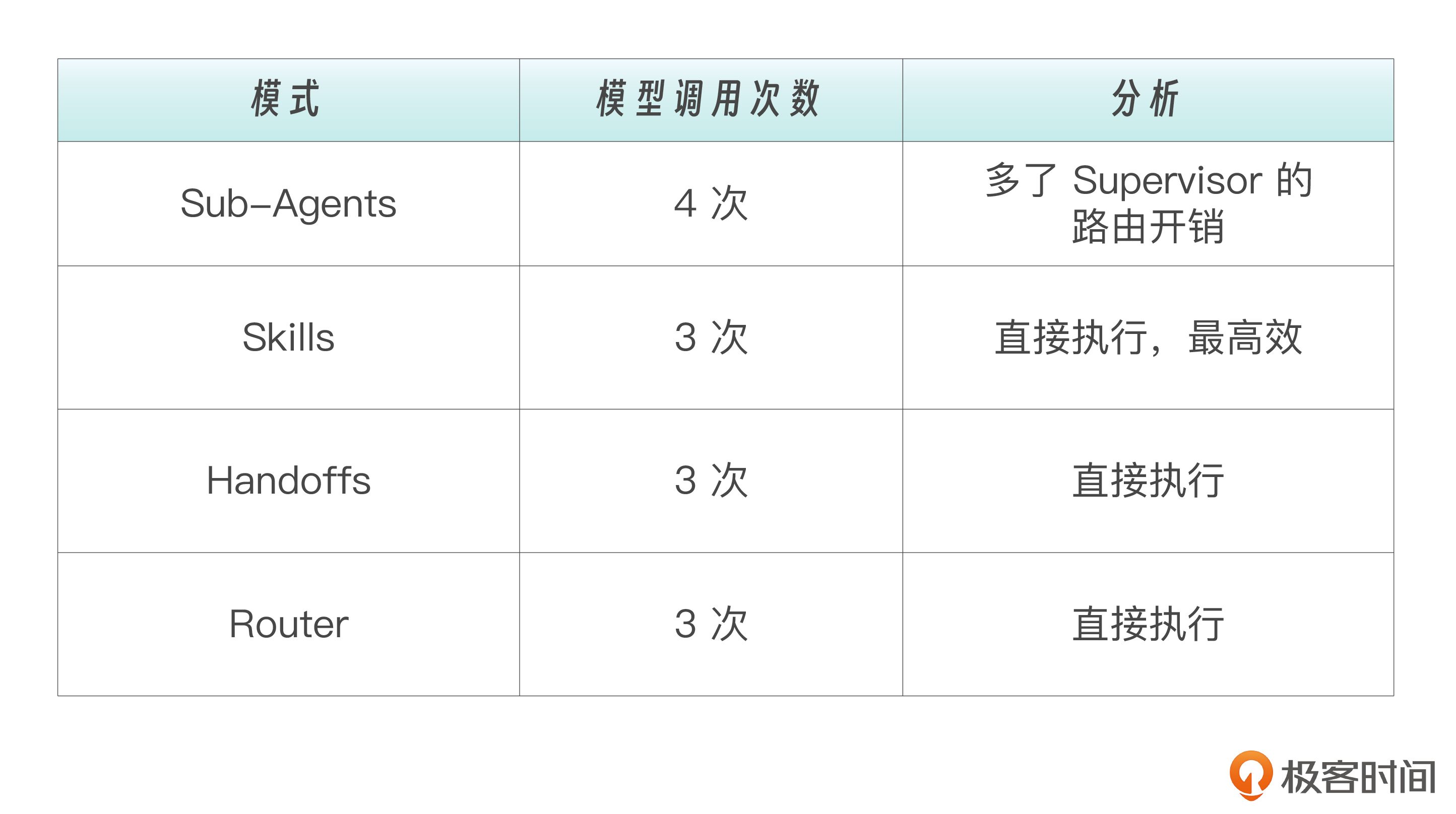 LangChain 对这四种模式做了实际的性能量化测试,分别从单任务请求的模型调用次数、重复请求的效率,和复杂问题的Token消耗三个方面进行了对比,结果非常有参考价值。