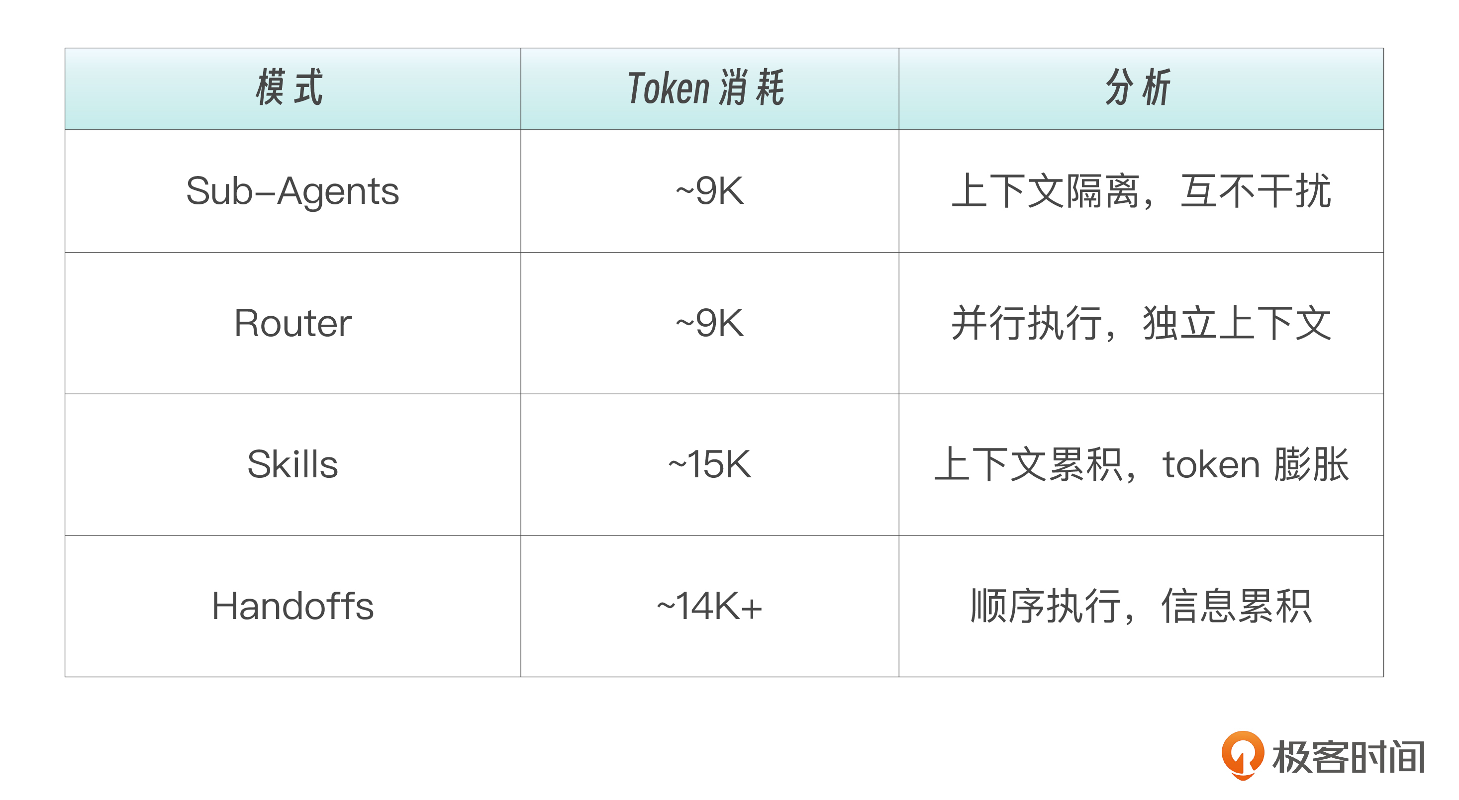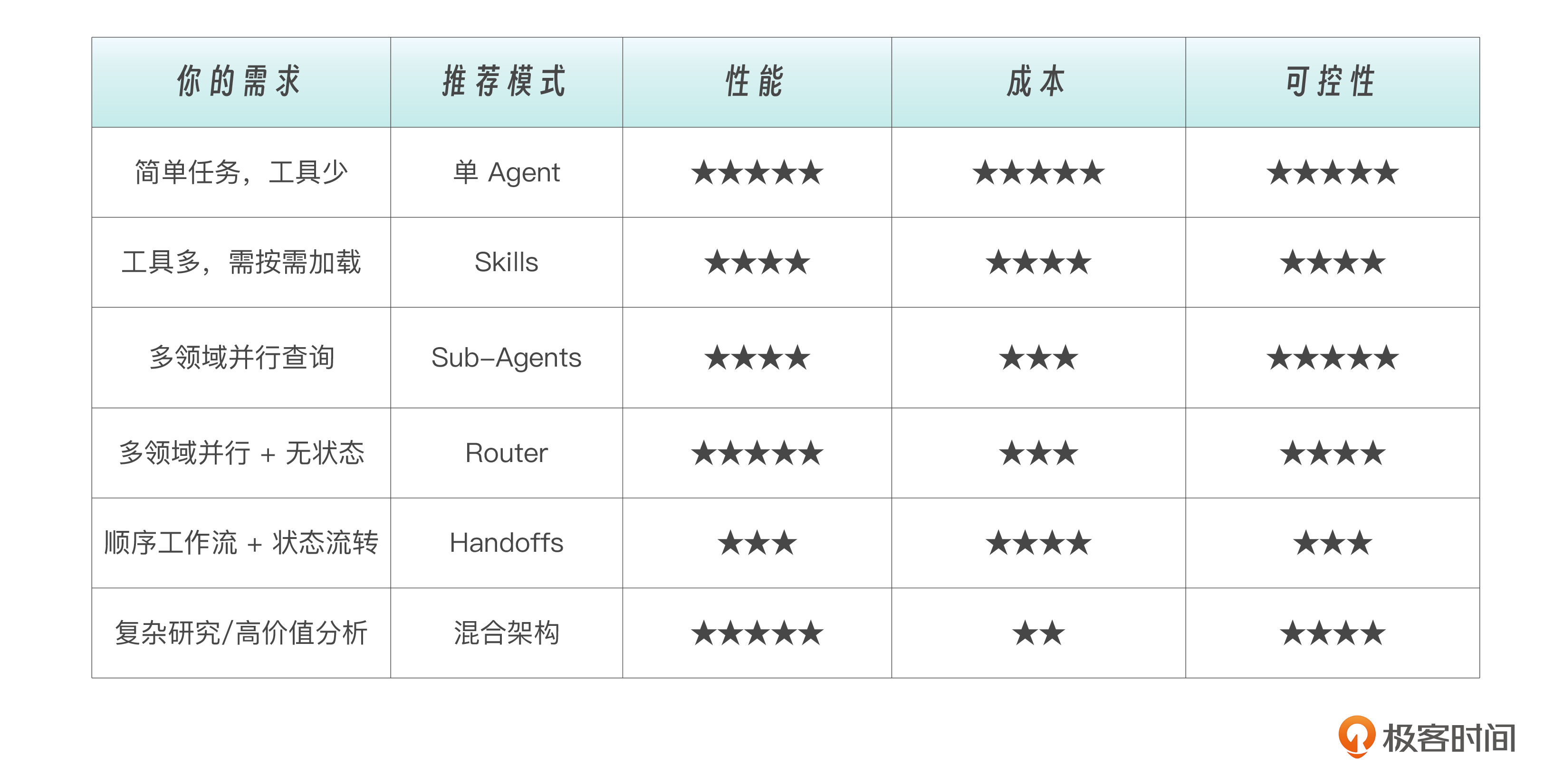 比较上面几个表的结论,可以看出,简单任务中,Sub-Agent 模式有额外开销。多轮对话中,有状态模式效率优势明显。而在多领域查询中,上下文隔离的模式(Sub-Agent、Router)在 token 效率上优势显著—— 节省 40% 以上的 token 成本 。