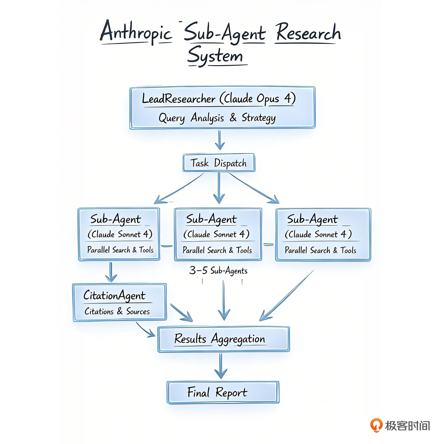 在 Anthropic 的真实生产系统中,Research 功能采用的就是一种典型的 Sub-Agent 架构。