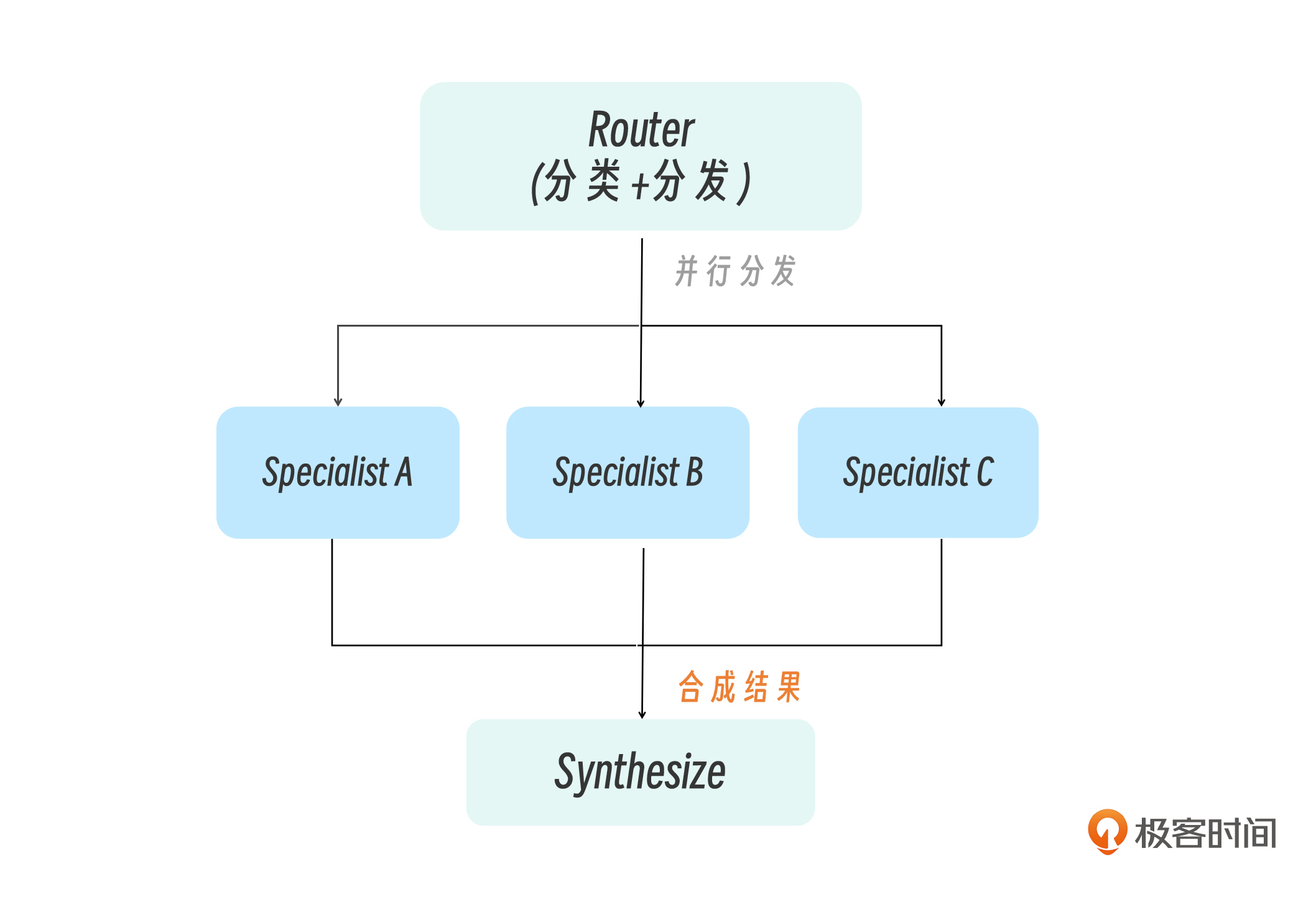 Router 模式的核心在于 对输入进行语义拆分与职责分流 。系统首先由 Router 对用户请求进行分类和分解,然后将子查询并行分发给各自负责的专业 Agent,最后再将多个结果统一合成为一个对用户友好的响应。