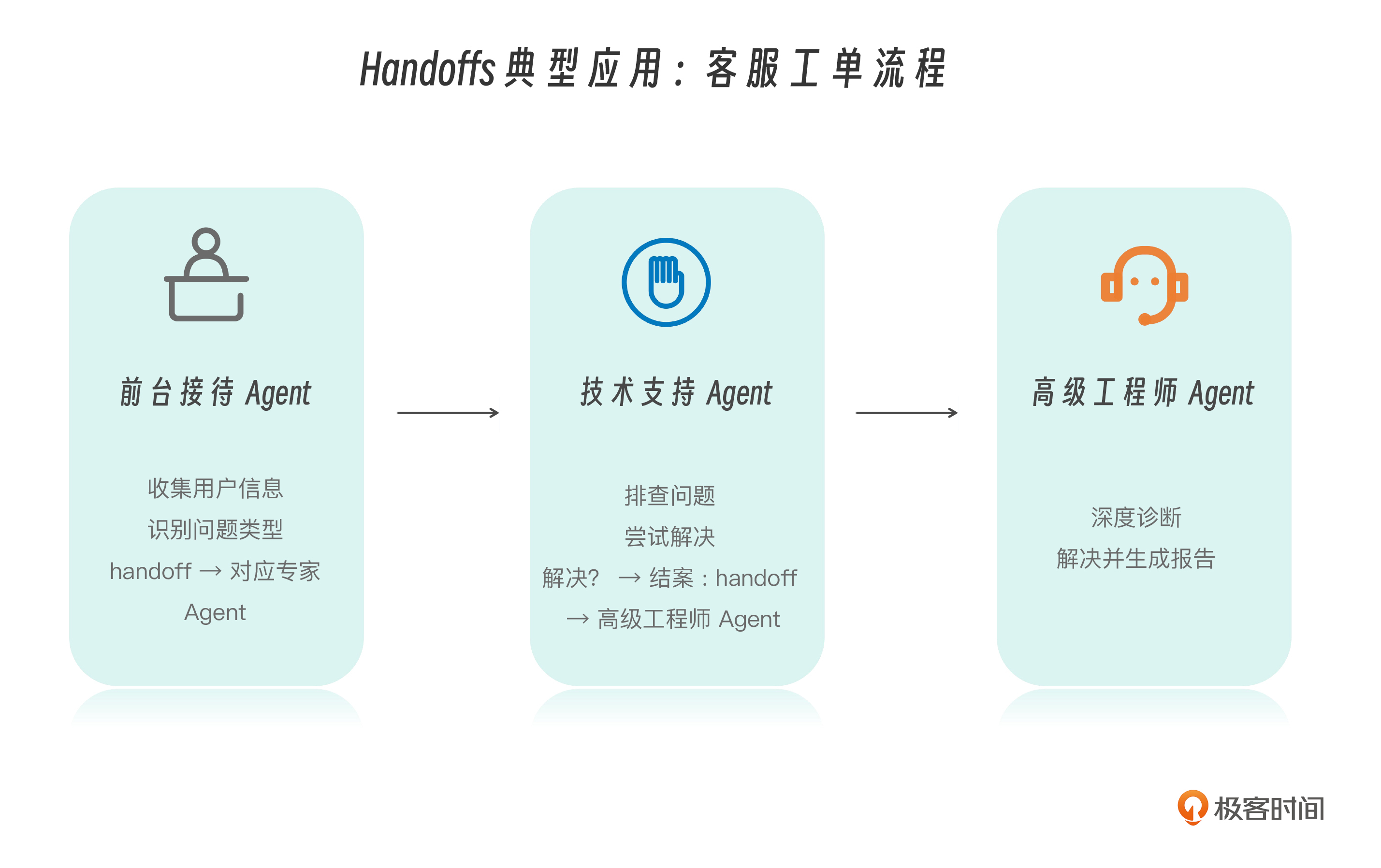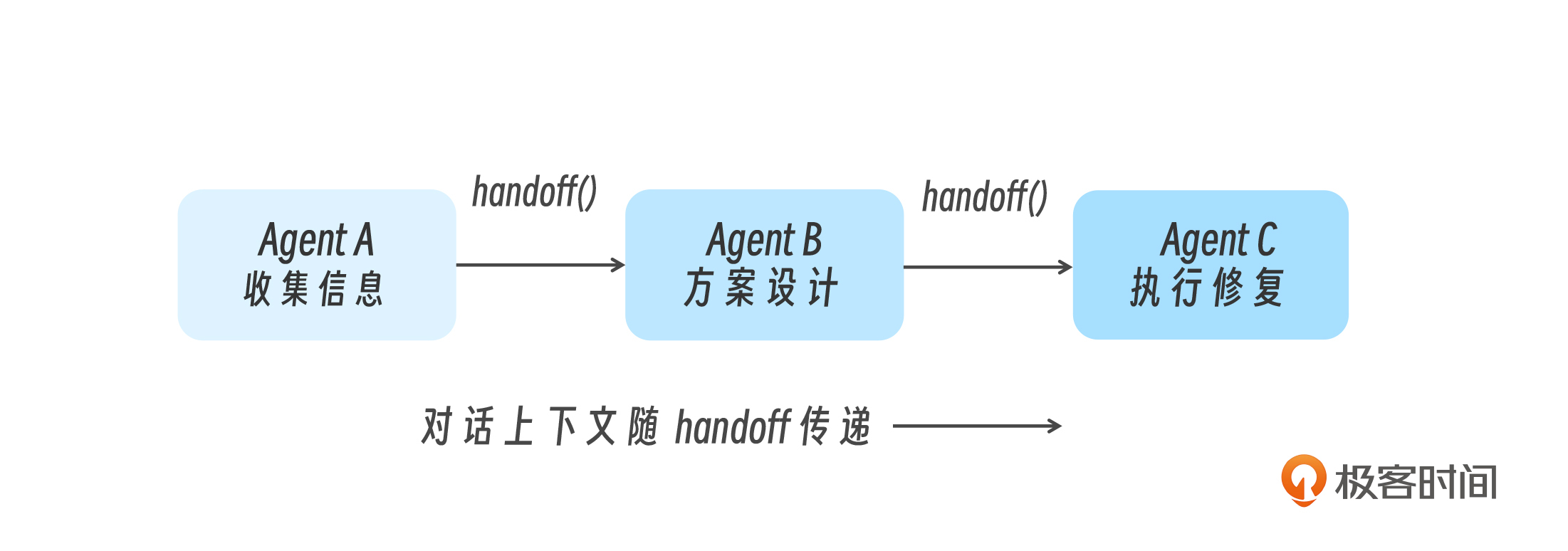 Handoffs的核心思想是 活跃的 Agent 根据对话状态动态切换 。Agent A 完成自己的阶段后,通过调用 handoff() 工具将控制权(和上下文)传递给 Agent B。