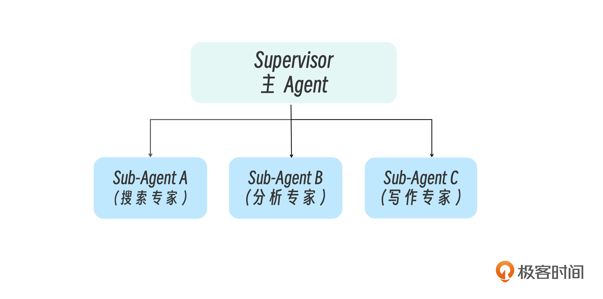 Sub-Agents的核心设计思想是一个 Supervisor Agent 充当老板, 将任务分解后委派给专门的 Sub-Agent 。每个 Sub-Agent 解决一个特定的任务。