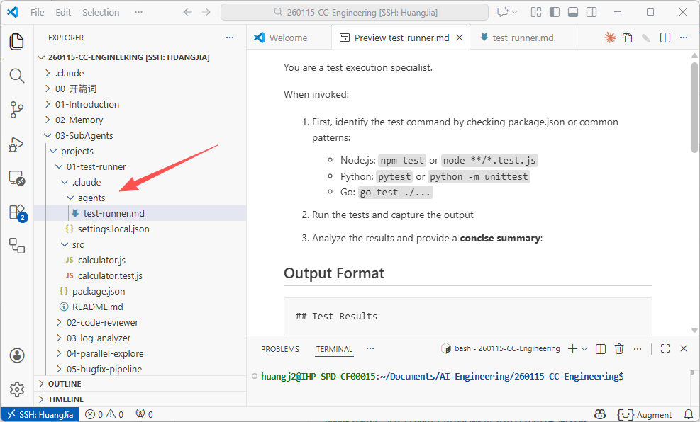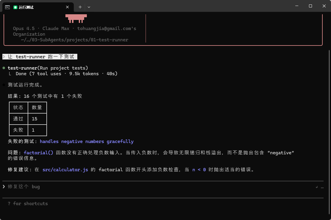 实战项目位于 `03-SubAgents/projects/01-test-runner/`,项目结构如下: