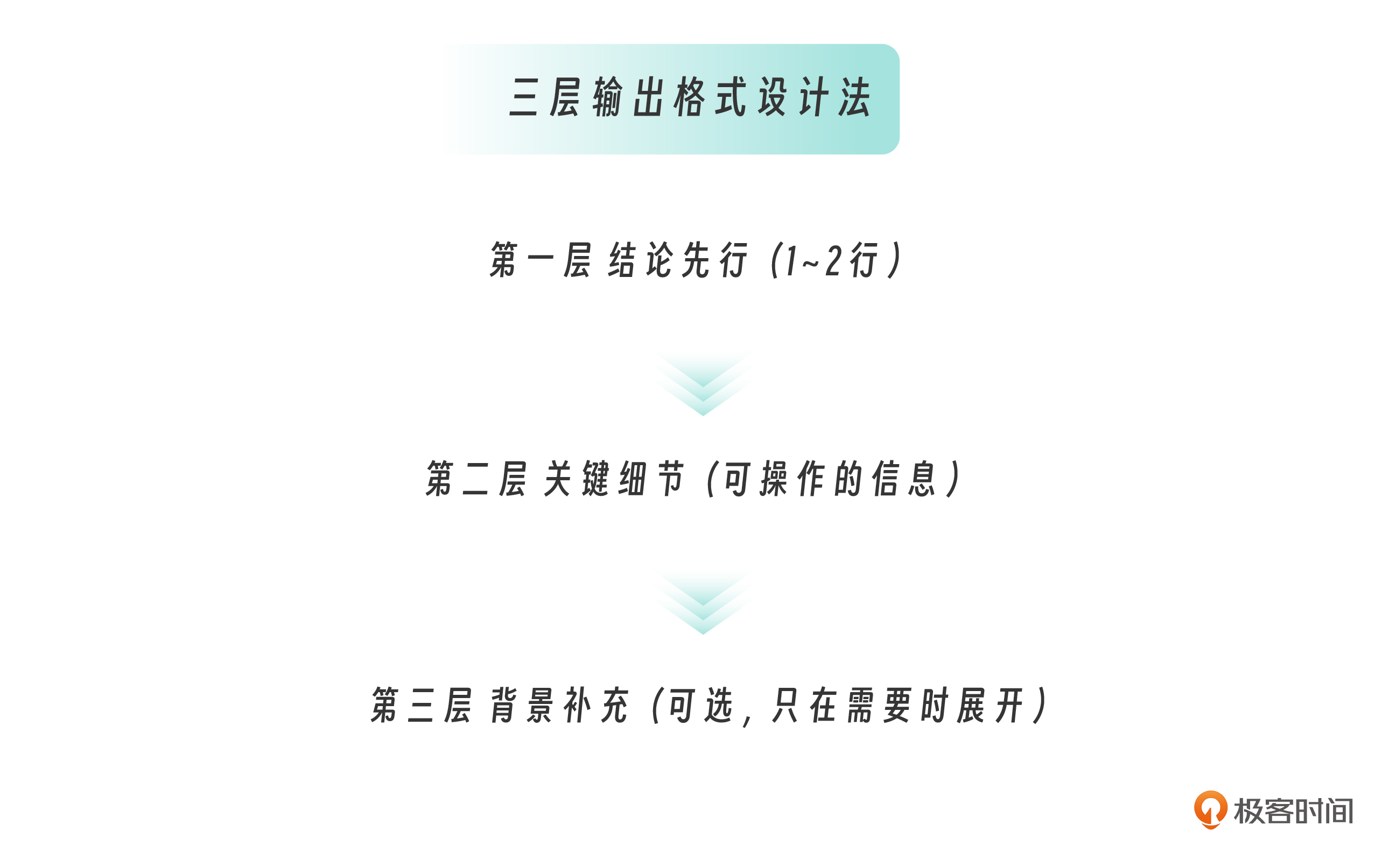 设计输出格式的四个原则是: 结论先行、可操作性、分层详略 和 为下游消费设计。