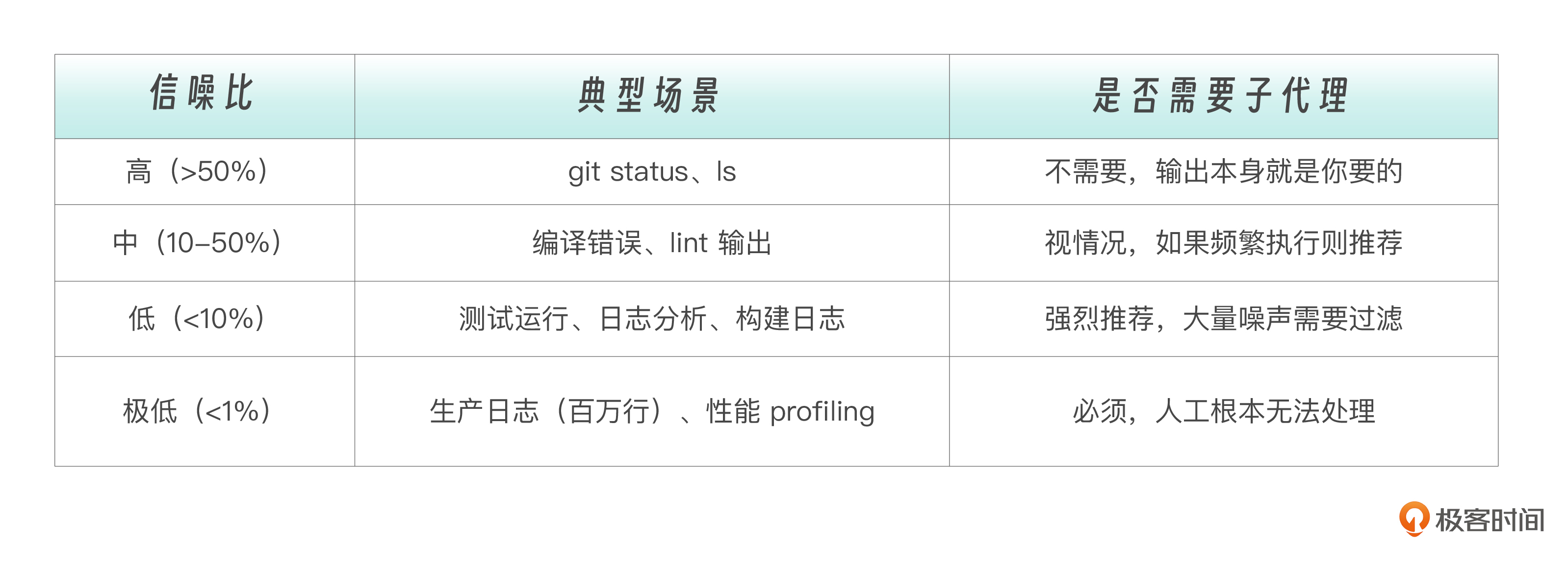 不是所有任务都需要子代理来处理。判断标准是 **信噪比** ——输出中你真正需要的信息占总输出的比例。