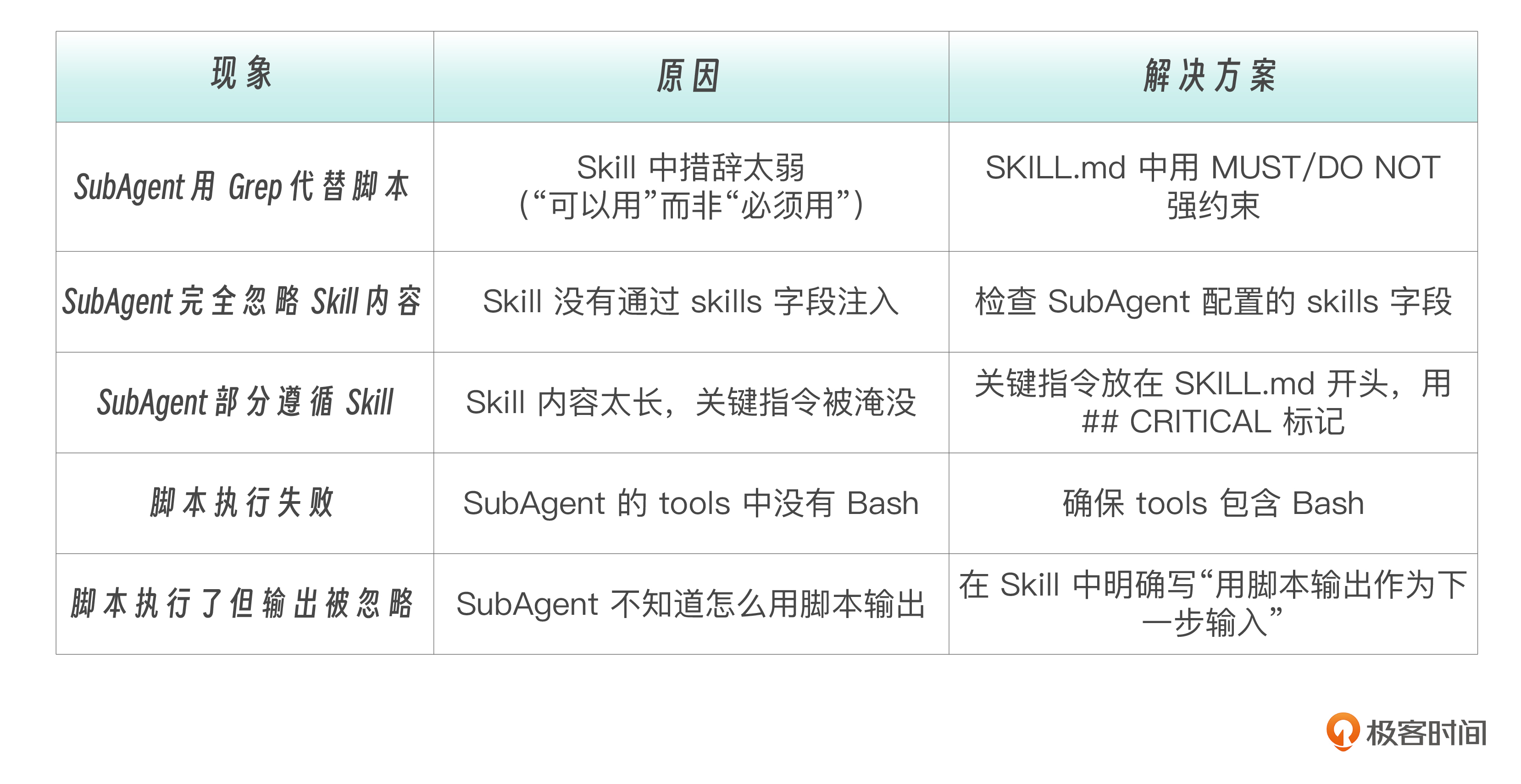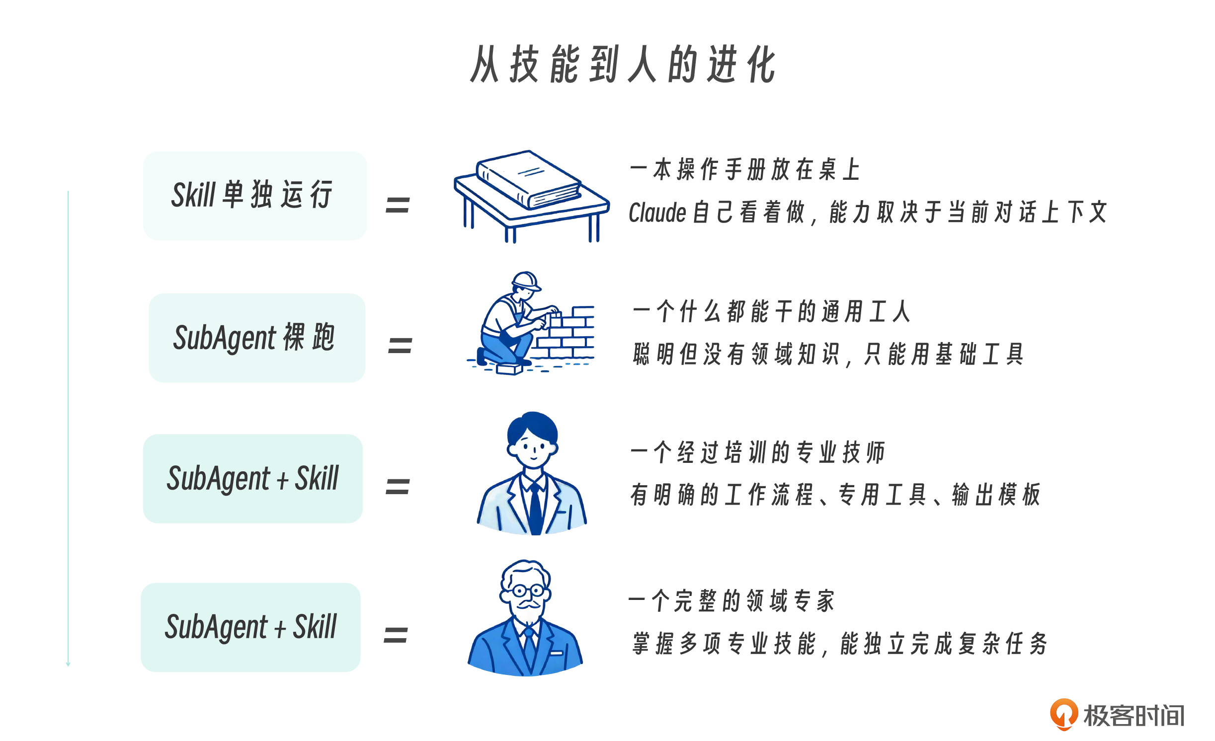 释题:珠联璧合。在这一课中,我们将通过三个项目和一条进化线:从构建生产级 Skill 到确保 SubAgent 真正执行它,把Skills 与 SubAgent 两大关键技术栈融为一体。你好,我是黄佳。前面我们学习了 Skills 的基础结构(第 9 讲)、任务型 Skills 实战(第 10 讲)和渐进式披露架构(第 11 讲)。很明显,Skills 单独使用已经很强,但它真正的威力在于 **与 SubAgent 组合** ——把一个通用的 Agent 打造成领域专家。 在这一讲中,我们先建立起全局视角,再 **设计一个好的 Skill** ,再来看 **怎么把Skills和 SubAgents 配合起来用** 。 那么这节课正好可以针对Jxin在子代理第一讲留言中提出的问题,给出答案。