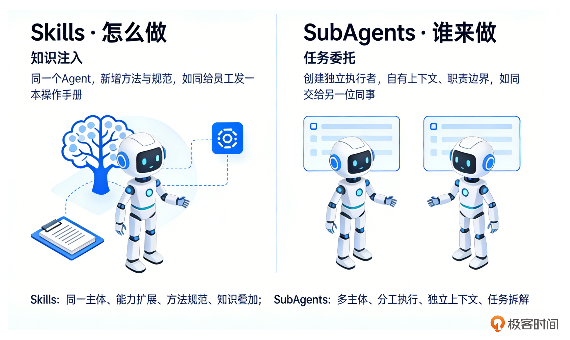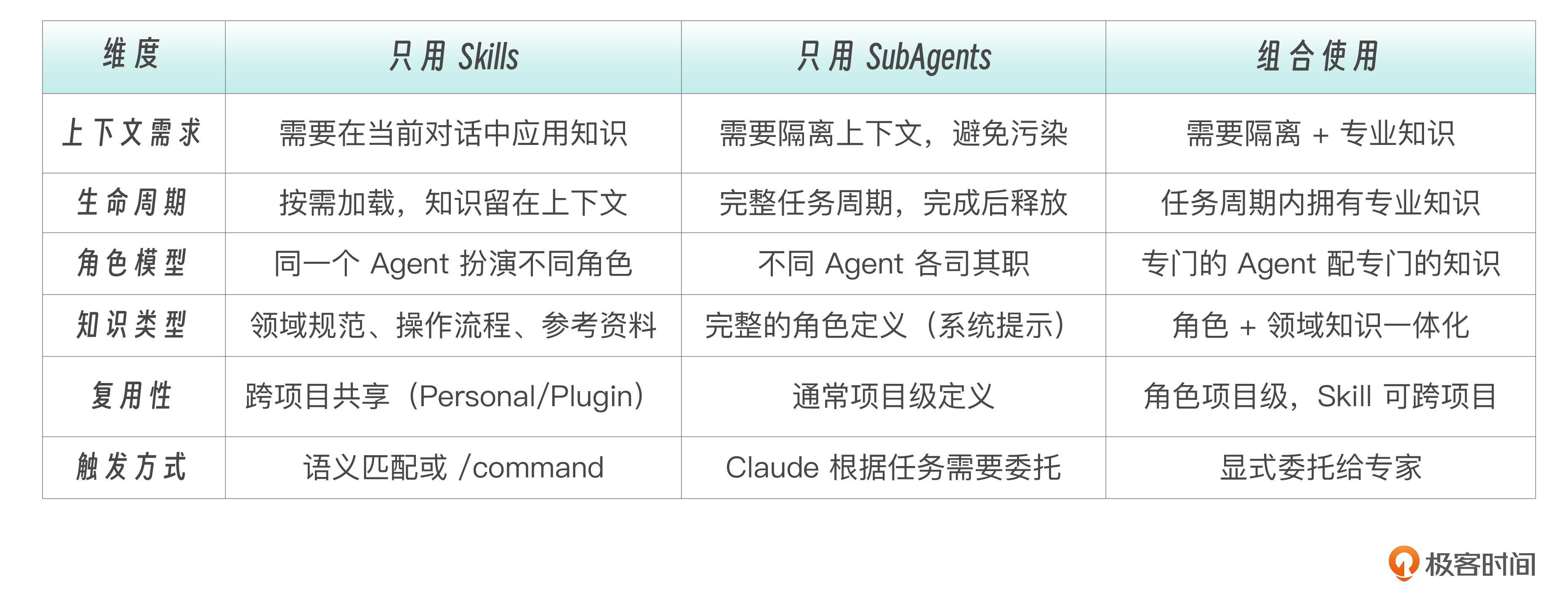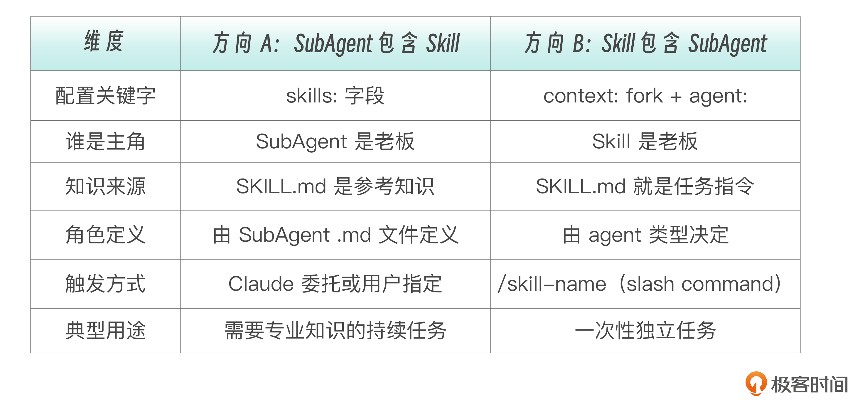 最后的最后,就记住一句话。 **SubAgent 定义“是谁、做什么”,Skill 定义“怎么做、用什么做”。两者各有所长,组合才完整。**