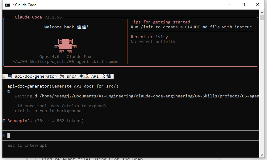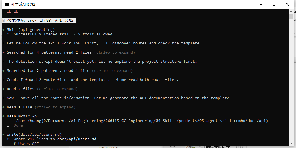 **阶段 2:Doc Writer。** 对应 Skill `doc-writing/SKILL.md`:包含文档模板 `endpoint-doc.md`,按模板生成标准化文档。