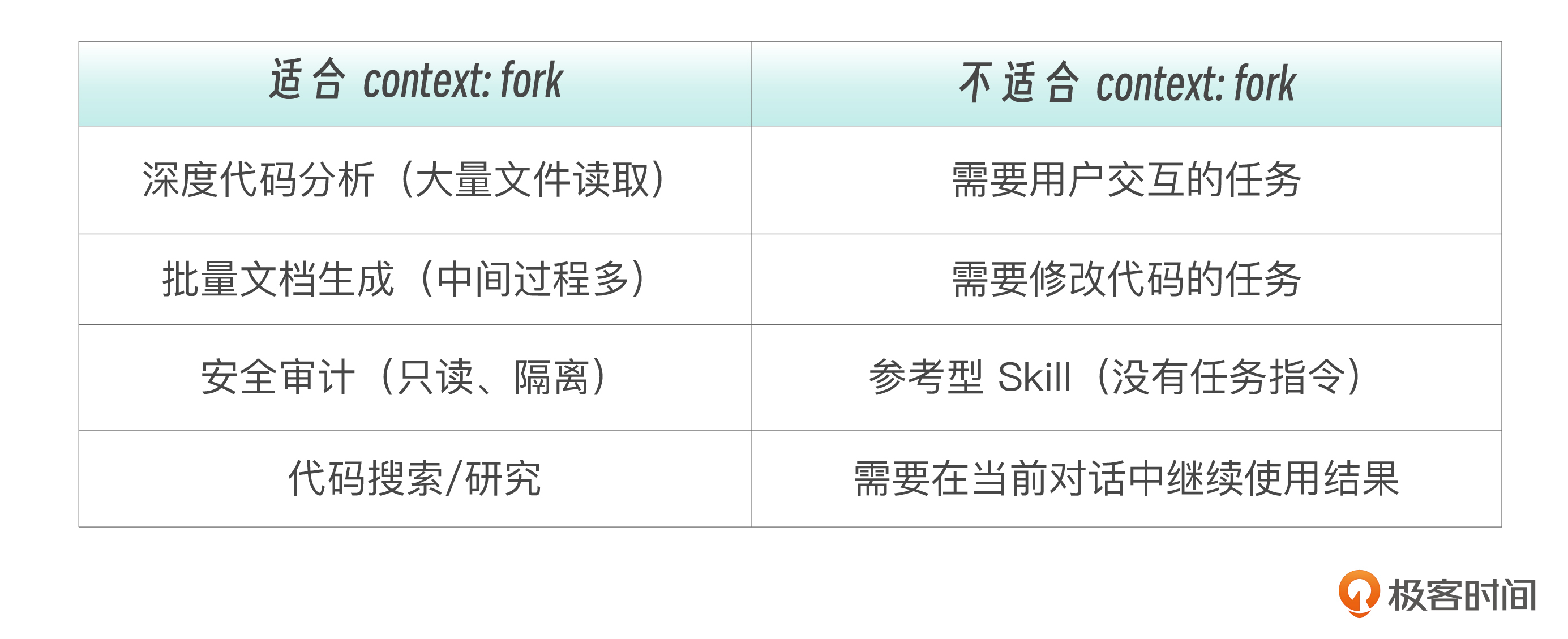这种应用方式的适用场景是 研究型任务(深度探索代码库,不污染主对话),重型生成(批量生成文档,中间过程不需要用户看到),以及安全隔离(Skill 的操作不应影响主对话状态)