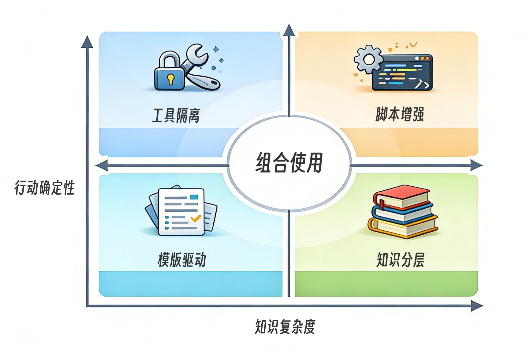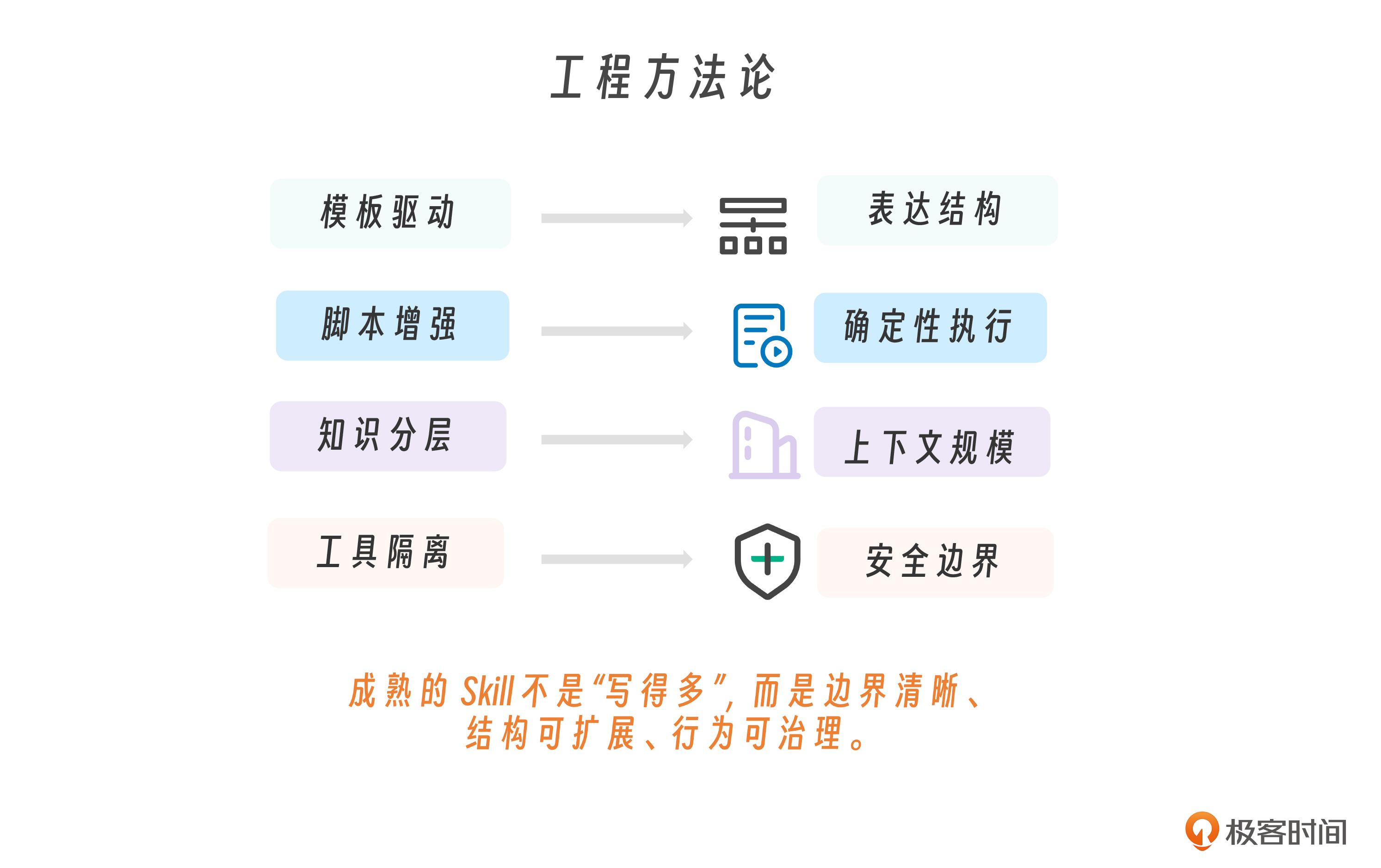 从工程方法论来看,四种设计模式——模板驱动、脚本增强、知识分层、工具隔离——分别控制表达结构、确定性执行、上下文规模与安全边界。它们不是技巧,而是职责分离的体现。成熟的 Skill 不是“写得多”,而是边界清晰、结构可扩展、行为可治理。