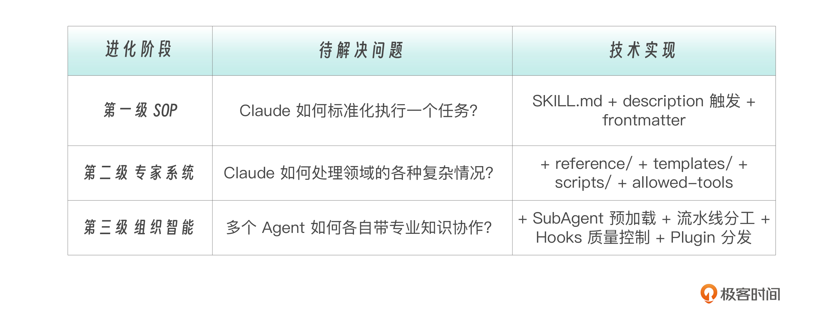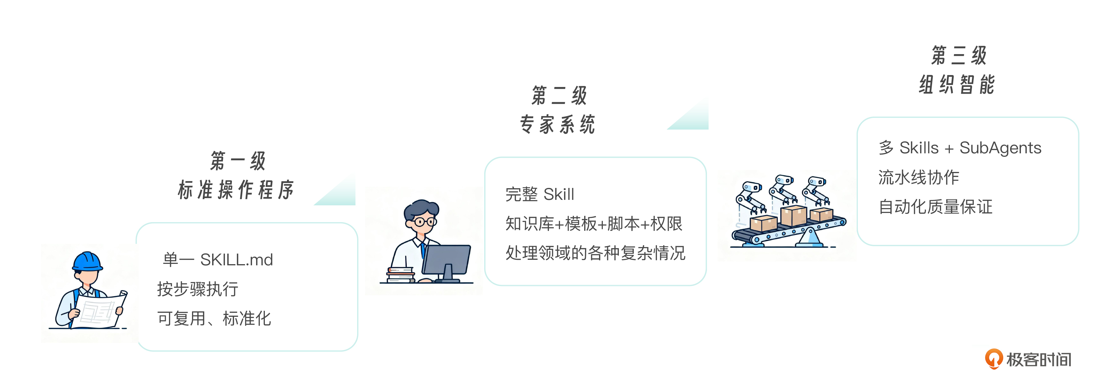 回顾 Skills 前几讲,我们实际上走了一条从简单到复杂的进化路径。这条路径映射到企业的知识管理成熟度。