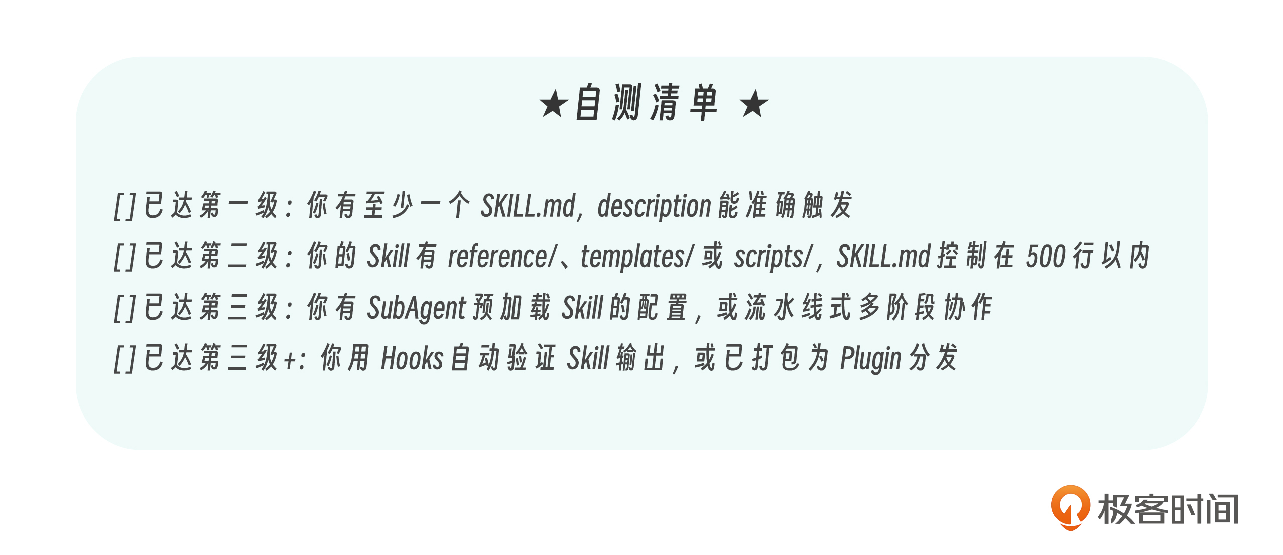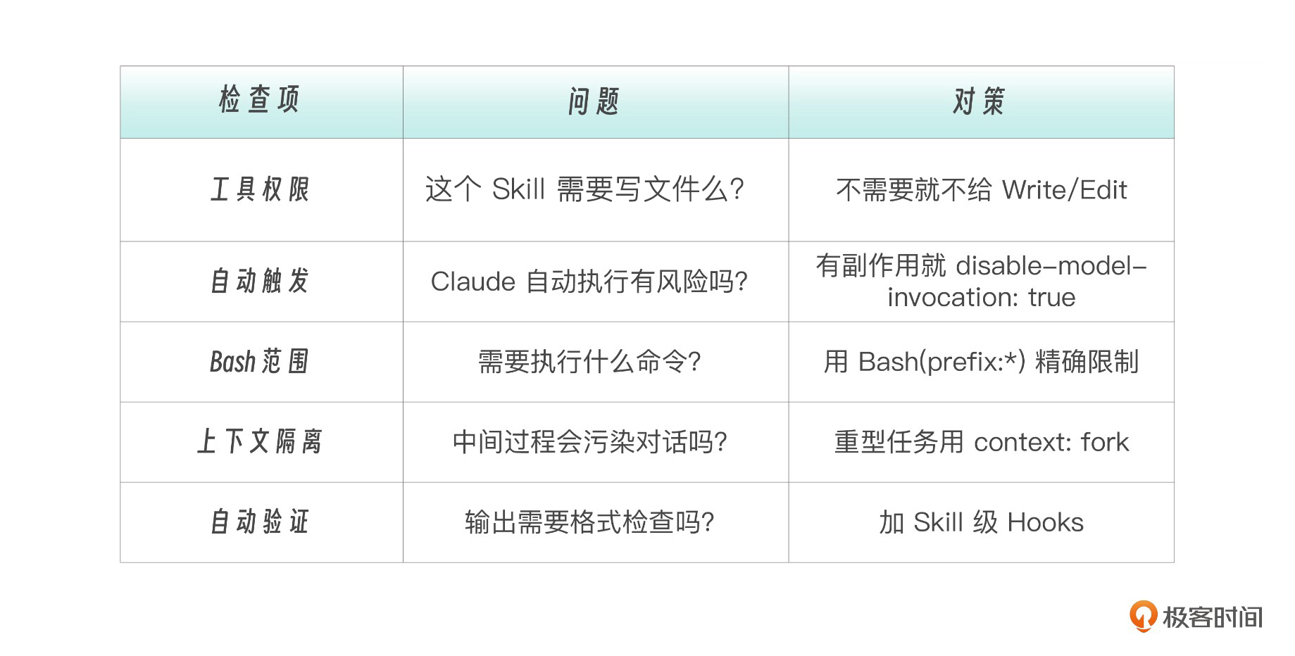 设计一个生产级 Skill 时,建议按照 Skill 安全设计清单逐项检查。我为你做了一个参考表格。