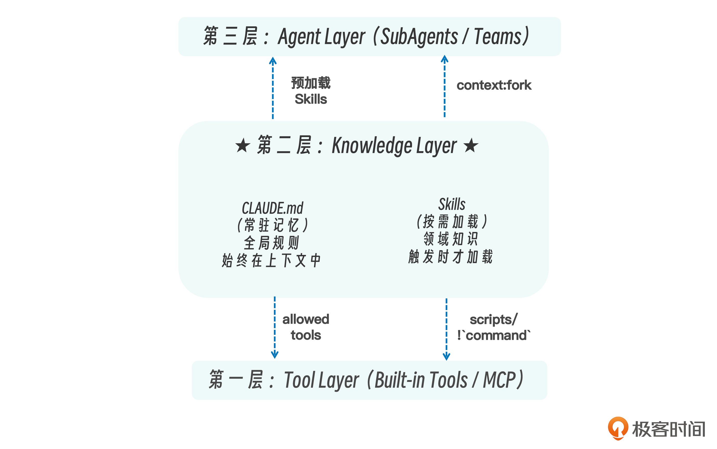 向下,它通过 allowed-toolsscripts/ 对 Tools 进行约束与编排,本质上是用知识来规范行动边界,相当于“知识约束行动”。向上,它为 SubAgents 提供预加载的专业知识,使子代理在决策前就具备特定领域能力,本质上是“知识服务决策”。