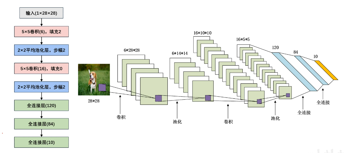特征提取部分:由两个卷积层和两个平均池化层组成;全连接层:由三个全连接层组成。