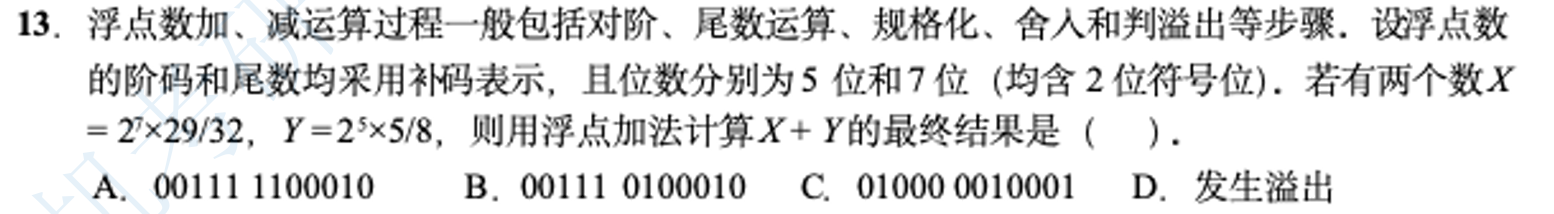 浮点数计算 x=27×00.11111y=27×00.00101x+y=27×01.00000=28×00.100000 阶码溢出 小端存储 FF FD 为 FD FF 错误点:两个16进制数为1字节 微程序 互斥类包含微命令 n 个,需要 ⌈log2(n+1)⌉ 位 IO数据线传输: 命令字、状态字、中断类型号